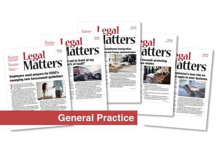 Yes! Sign me up for Legal Matters General Practice Newsletters! I will receive quarterly location-neutral newsletters as indicated below that I can customize with my organization's logo and distribute to clients and prospective clients.